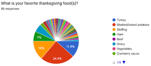 Thanksgiving: a holiday that celebrates family and friends. This year, I was curious about how the Montrose population viewed Thanksgiving food. Was it good? Was it overrated? These are the types of questions I asked myself before beginning this process. Many do not celebrate Thanksgiving – and that’s ok! These foods are universal and can be rated without the holiday association. Here are the results of the form: